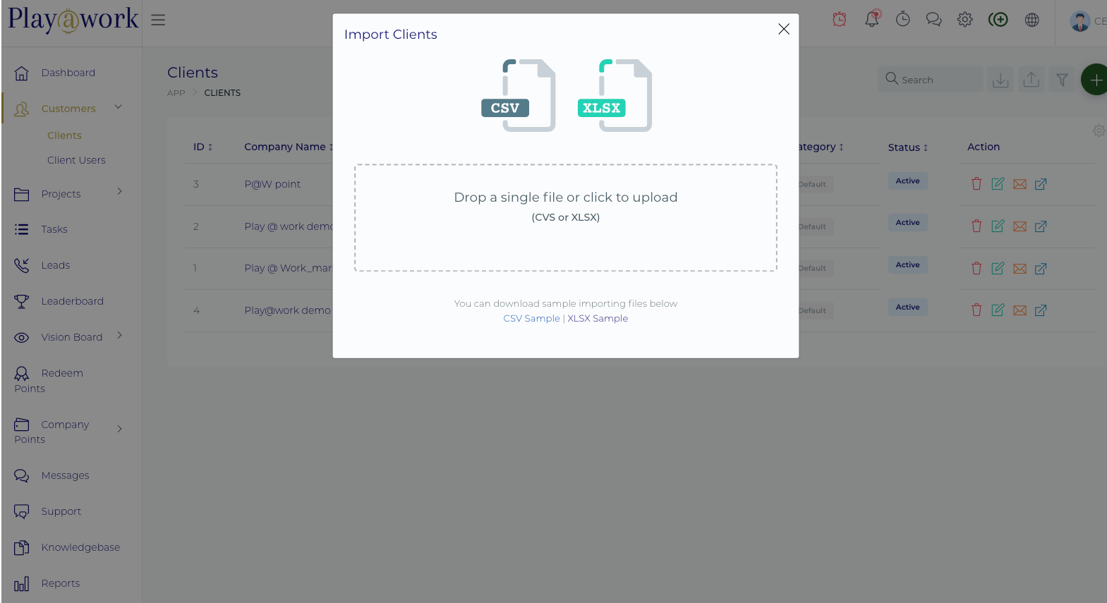 The Play at work.io Platform allows you to import hundreds of client accounts in a matter of seconds using either CSV or Excel (XLSX) files. This feature is crucial when migrating client data from previous systems or populating a large initial database. For each successfully imported row, the system automatically creates both the client organization profile and the primary client user for that account.