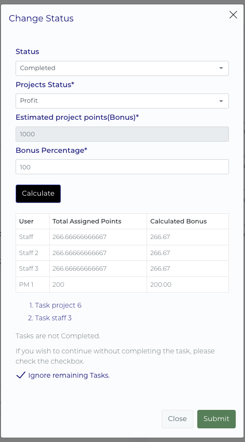 Staff Bonus Details: A breakdown of the Bonus Amount and Percentage allocated to each team member.