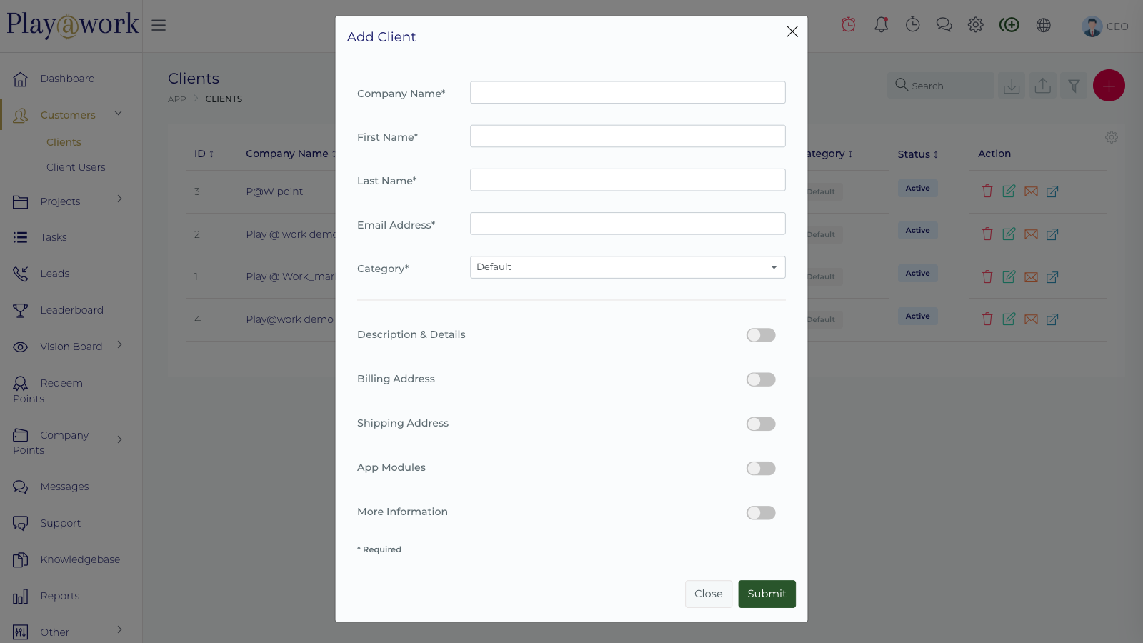 The Client Settings page within the Play at work.io Platform is where Administrators configure the organization-wide behavior for client accounts and the client-facing portal.