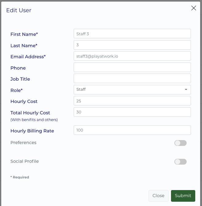 In Play at Work, each user can have an hourly cost assigned to their profile, set by an Admin. This rate represents the cost of their time and is automatically factored into any project they are part of.