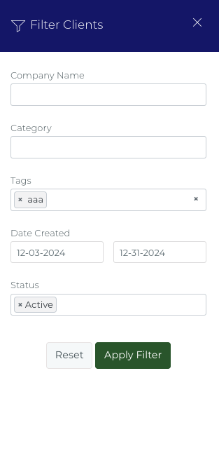 Show in filter panel: Makes the custom field an available option when searching and filtering your list of clients.
