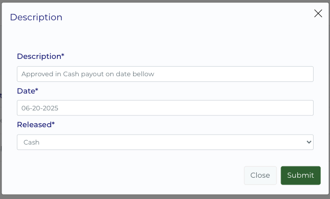 Submit Request: Enter the withdrawal amount (with a minimum amount specified) and a description (optional). Click "Submit Withdrawal".